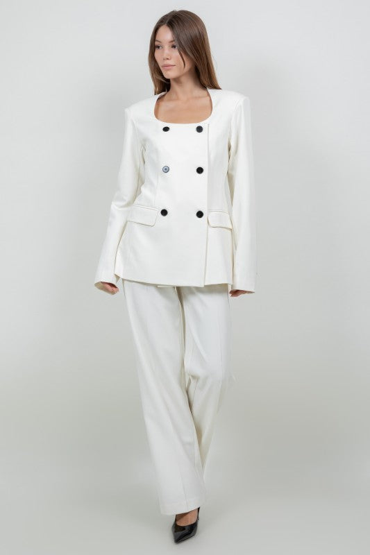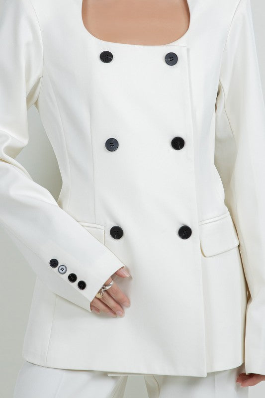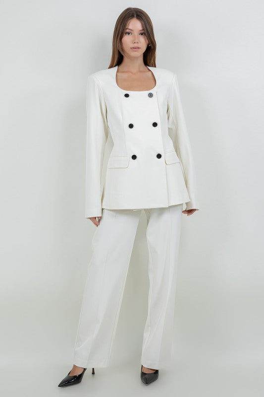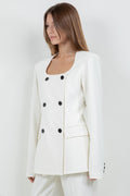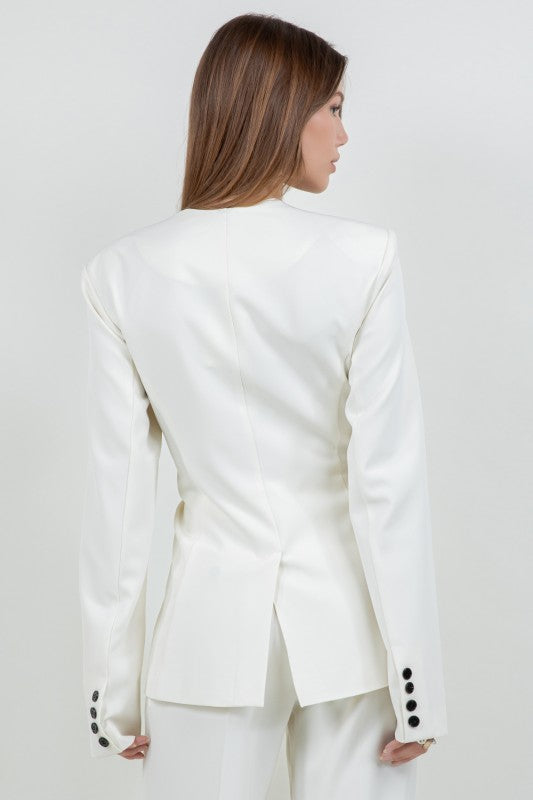 Double-breasted structured woven blazer featuring a sleek collarless design for a modern, minimalist look. Expertly tailored with clean lines and a defined silhouette, this piece offers a polished finish while maintaining a contemporary edge. The structured woven fabric enhances its refined shape, making it a versatile statement layer for both professional and chic casual ensembles.