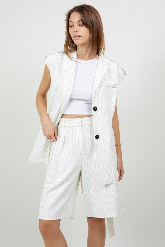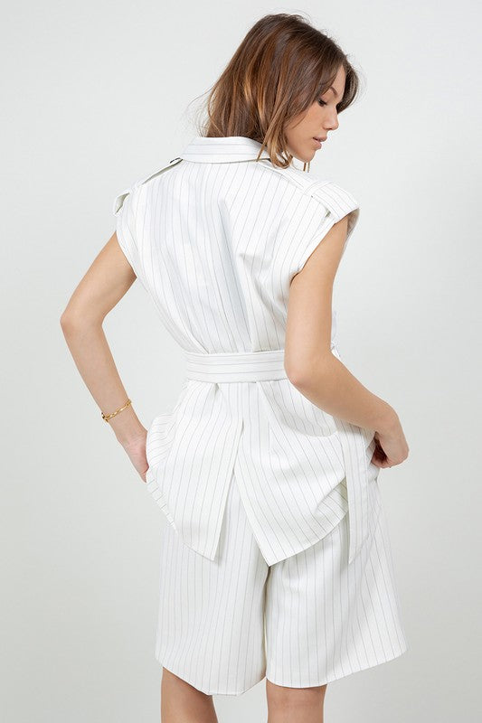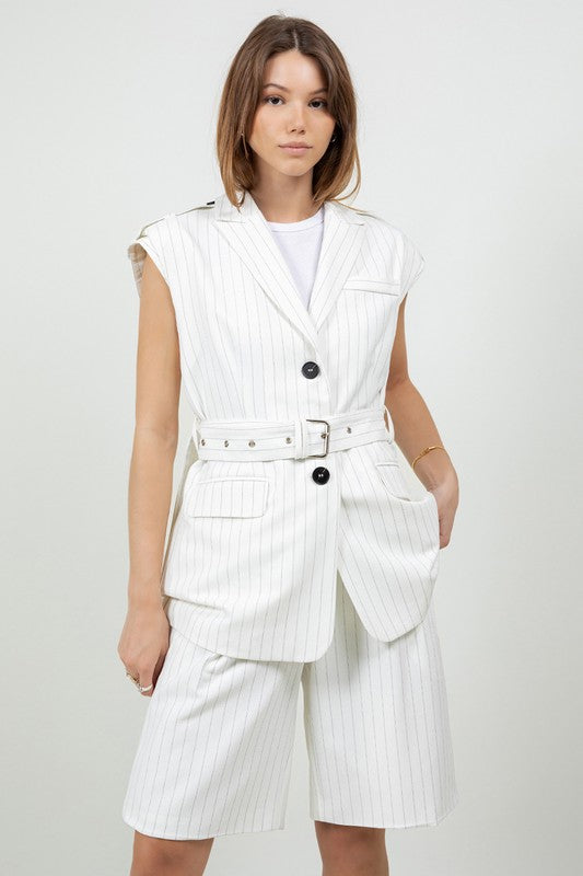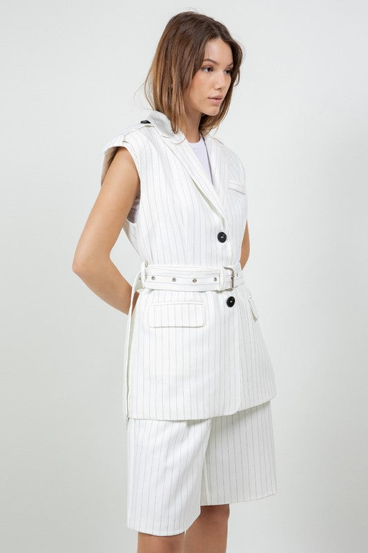 Lightweight pinstripe vest designed with a tailored fit and subtle sophistication. Crafted from breathable fabric with fine pinstripe detailing, it features a matching belt that cinches the waist for a flattering, structured silhouette. Perfect for layering over blouses or pairing with matching trousers, this vest adds a refined, modern touch to any look.